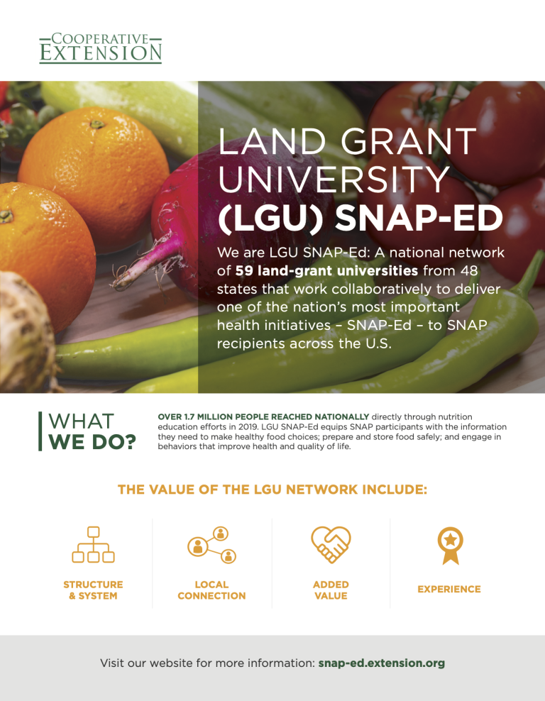 The Land-Grant University (LGU) Supplemental Nutrition Assistance Program Education (SNAP-Ed) Program Development Team has created the Nourishing Communities: Nutrition Education That Works website to provide decision-makers with information about how LGUs deliver SNAP-Ed to communities across the nation. We are LGU SNAP-Ed, a national coalition of 58 land-grant universities that work collaboratively to deliver one of the nation’s most important health initiatives – SNAP-Ed – to SNAP recipients across the U.S. We hope that this information helps you better understand SNAP-Ed and the critical role that LGUs play in delivering this vital program to millions of Americans each year.